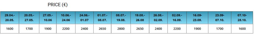 SKIPPER: 180€/day + nourishing, 1350€/week + nourishing